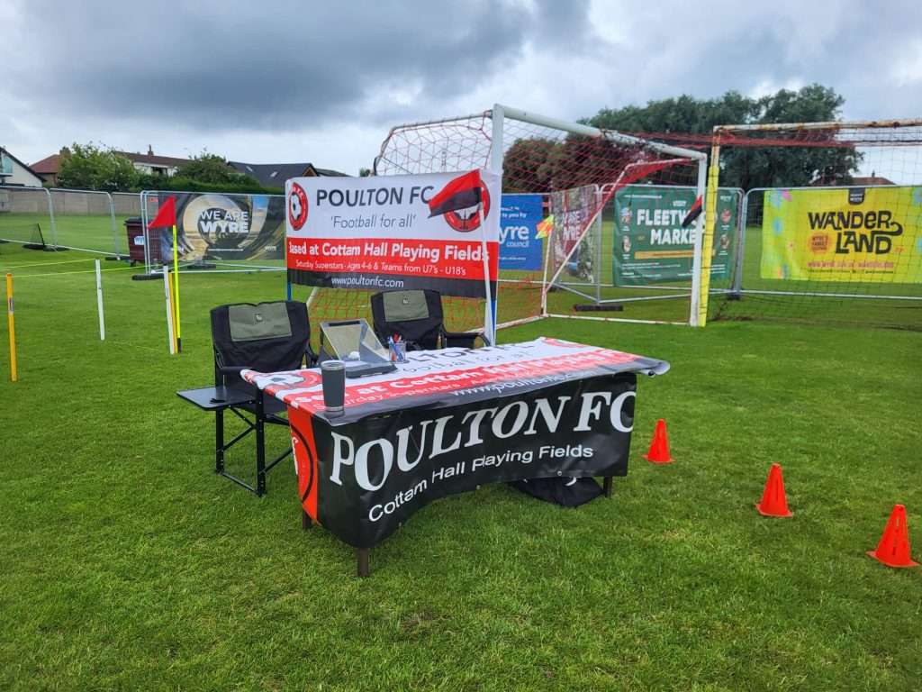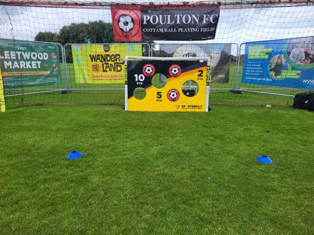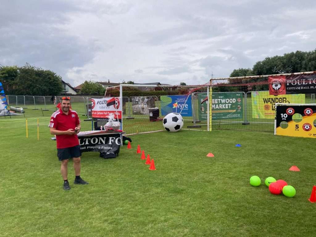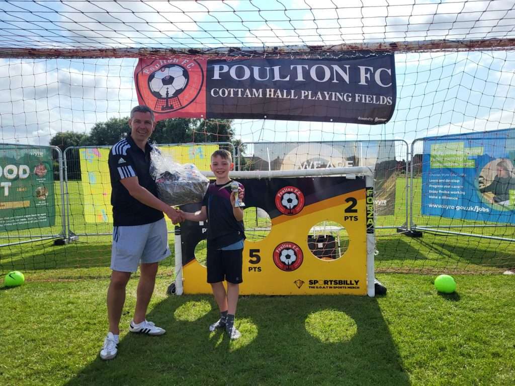 Poulton FC hosted a penalty shootout competition at the Wyre Council held event Wanderland on Saturday 26th July. The Stall looked fantastic and attracted lots of attention from kids and parents.Norm, Catherine and Mark were kept busy all day with queues of kids and adults wanting to score the highest! The winner who topped the score sheet a couple of times throughout the day, but always returned to re-clinch the top spot when his score was beaten. He was presented with his Sweet Hamper and Penalty king trophy by Club Secretary Mark Rollins. Post Views: 15 22 Like Post navigation Pamodzi Boys Academy, Zambia kitted out in PFC kit! ???? NEW SIGNINGS ????